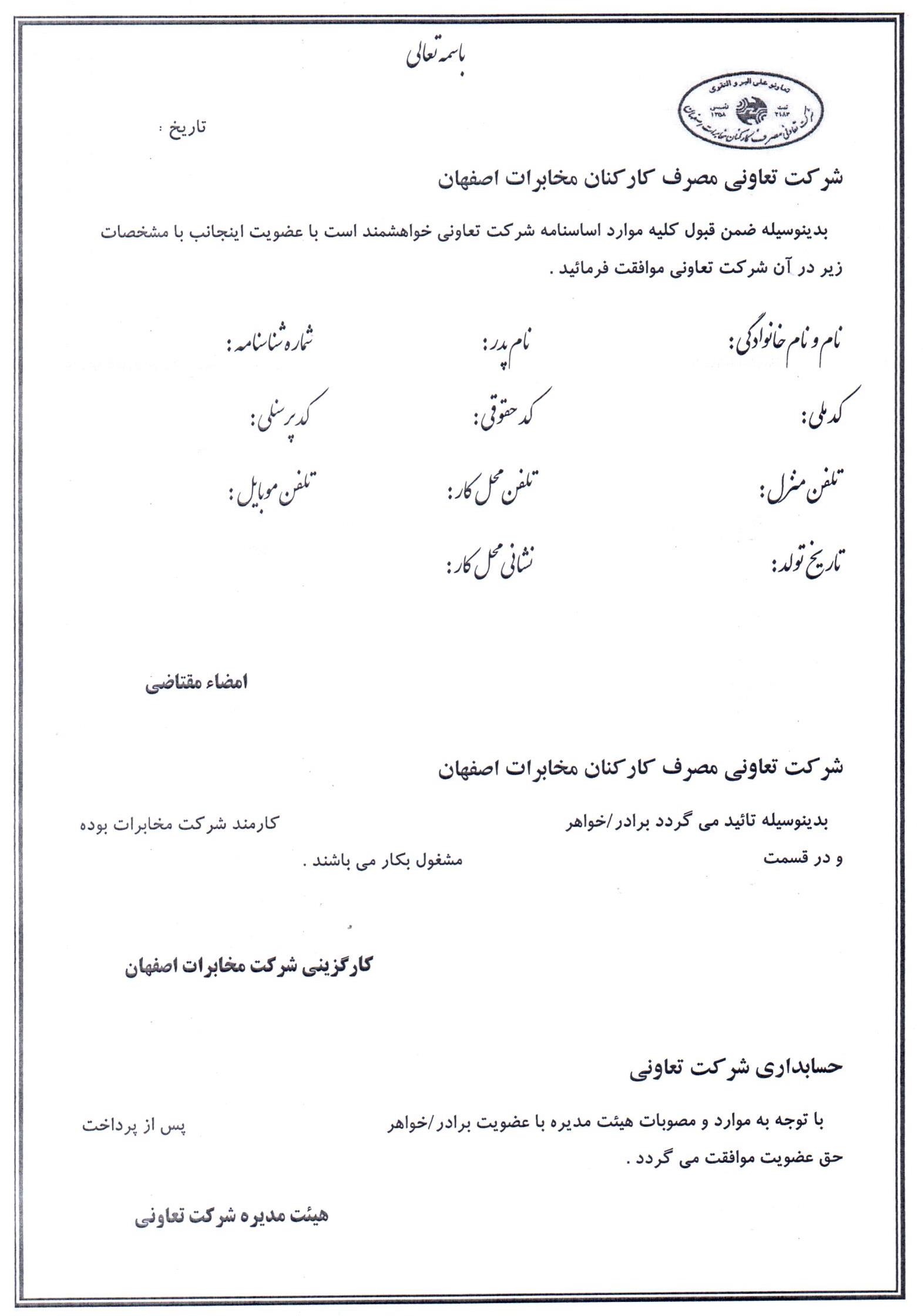 همکاران رسمی که تمایل به عضویت و استفاده از مزایای آن را دارند ، می توانند فرم عضویت را دانلود یا بصورت حضوری از شرکت تعاونی دریافت کنند و پس از تکمیل و تأیید آن توسط کارگزینی ، فرم مربوطه را به همراه تصویر کارت ملی و شناسنامه تحویل تعاونی دهند تا پس از تأیید هیأت مدیره و پرداخت مبلغ 90 میلیون ریال (بصورت اقساطی) ، عضویت آنها انجام پذیرد .